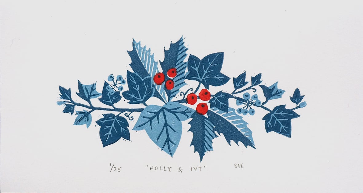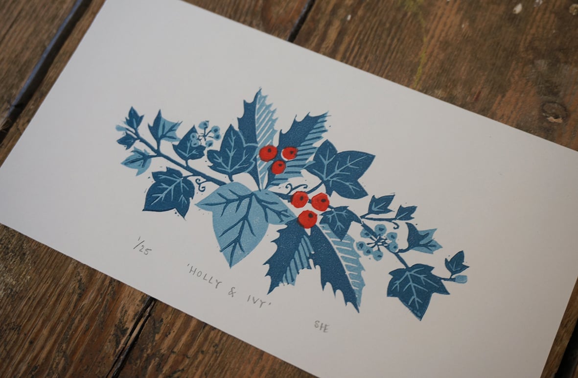'Holly & Ivy' is a three colour linocut inspired by winter foliage.