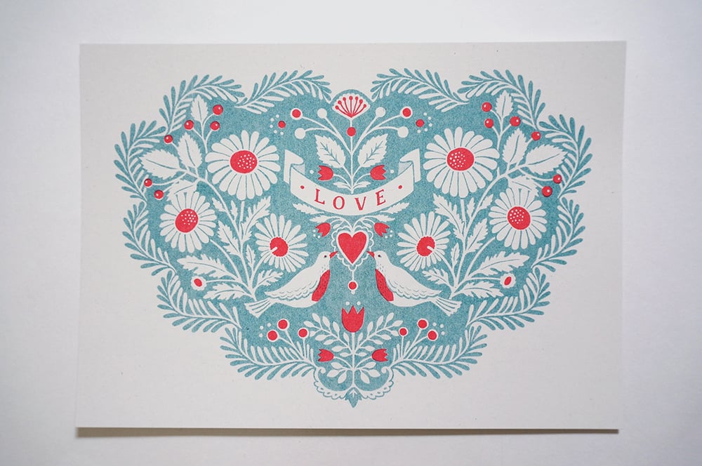 All prints are hand burnished using a wooden baren and spoon. I use oil based inks for their longevity and vibrant colour.