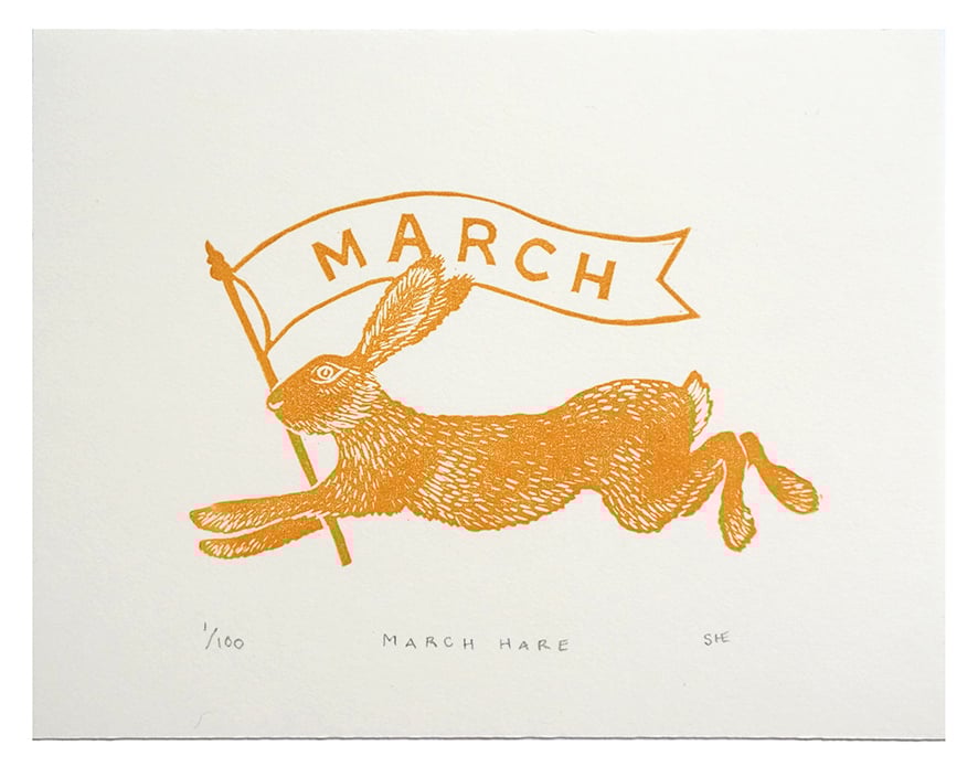 'March Hare' is a one colour linocut print depicting a leaping hare, with a banner reading MARCH. It is printed in a rich golden ochre yellow.