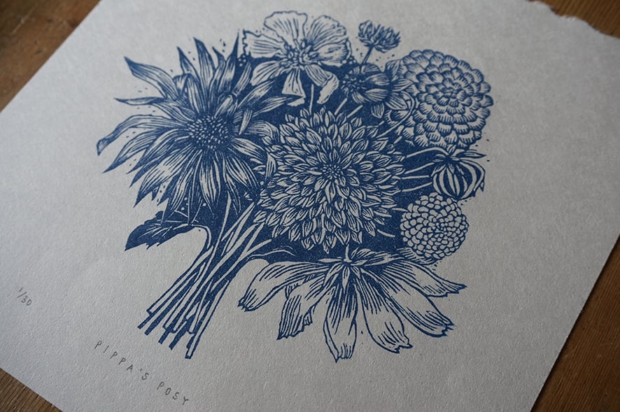 'Pippa's Posy' is a one colour linocut print depicting a posy of blooms. It is printed in a deep blue.