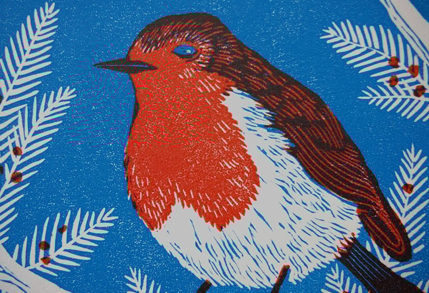 'Robin' is a two colour linocut inspired by the many robins that I saw whilst on holiday in Cornwall, with a little wintery twist. Also inspired by vintage Christmas postage stamps and midcentury illustrations.