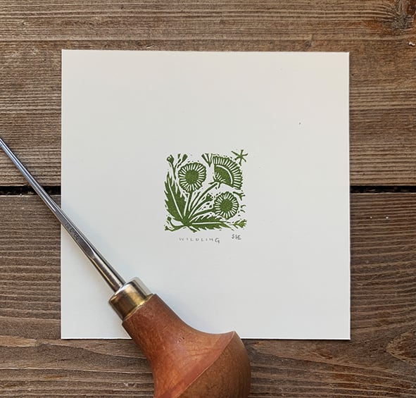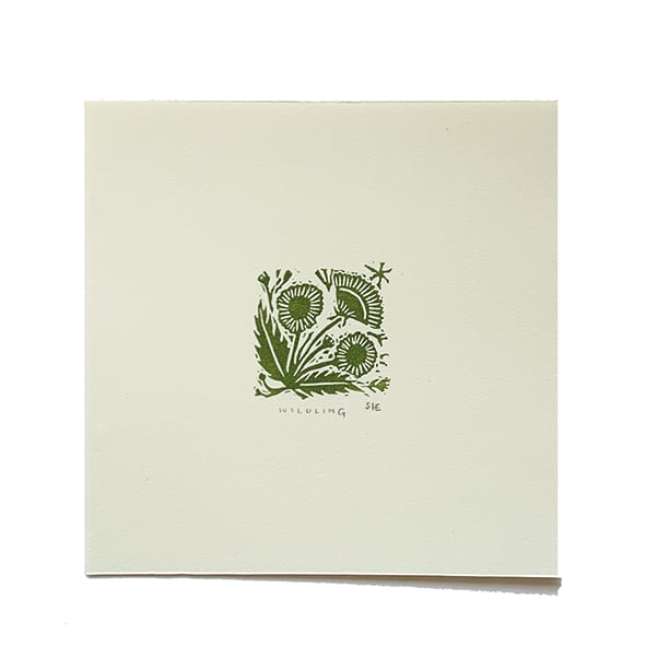 'Wildling' is a tiny little linocut. It is taken from an on going project where I'm cutting a tiny linocut stamp each day and printing them as a pattern. I thought this one was particularly sweet on it's own. The colour is a rich olive-y green.